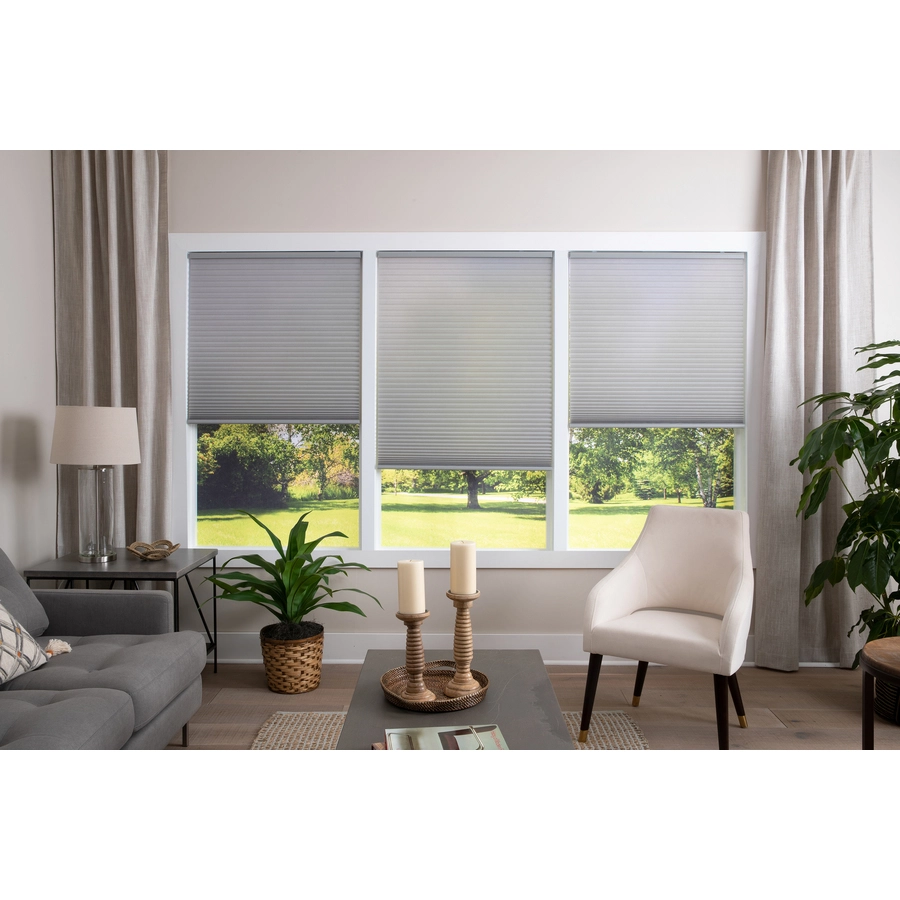 The allen + roth Light Filtering Recycled Polyester Cellular Shades are eco-friendly, supporting a cleaner environment and addressing the ever growing effects of discarded plastics. The recycled fabric blocks outside light and provides extra insulation as well from outside temperatures. The shades feature a crisp white backing for a clean, attractive exterior appearance. Take full control of privacy and the darkness inside your home. The cordless design is also an ideal choice to ensure safety for children and pets. Add beauty, functionality, and elegant style to your windows all while contributing to environmental sustainability.
