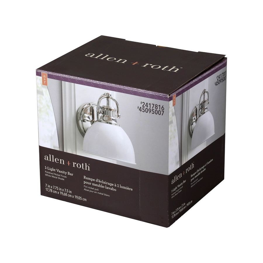 Perfect for a modern style décor, this vanity light from Allen + Roth has a polished nickel finish that offers a clean look and a white metal shade that enhances the look of your bathroom with a beautiful, diffused glow. Plus, the light is dimmable so you can adjust it to your liking. This 7-inch wall sconce requires one 60-watt medium base A19 bulb (not included). This damp-resistant fixture comes with a 1-year limited warranty.