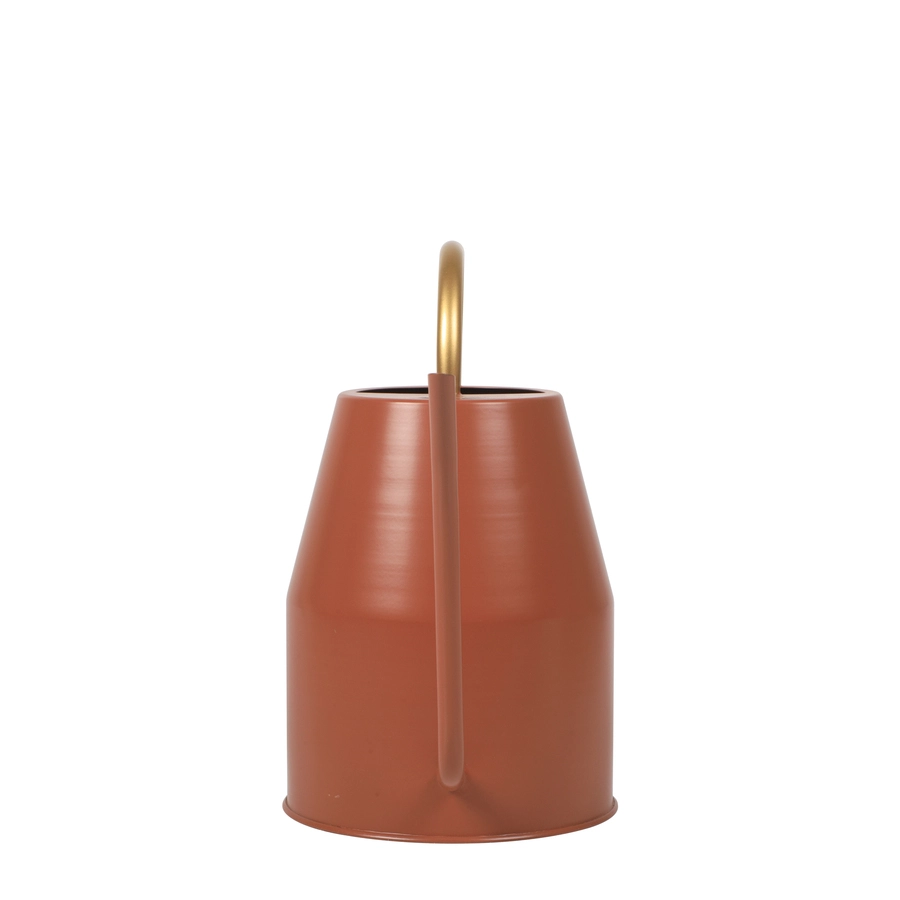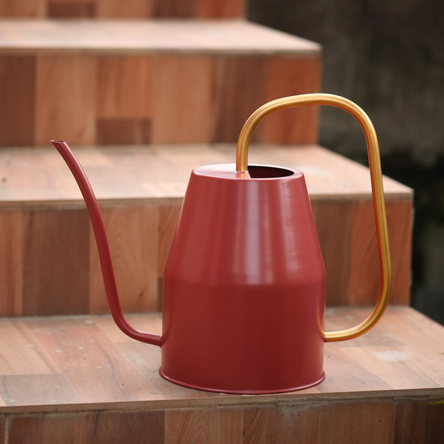 Auburn watering can with gold handle. Made from high quality iron sheet. Strong and leak-proof. Quality tested to make it weather resistive and provide a longer life. Handcrafted in India.