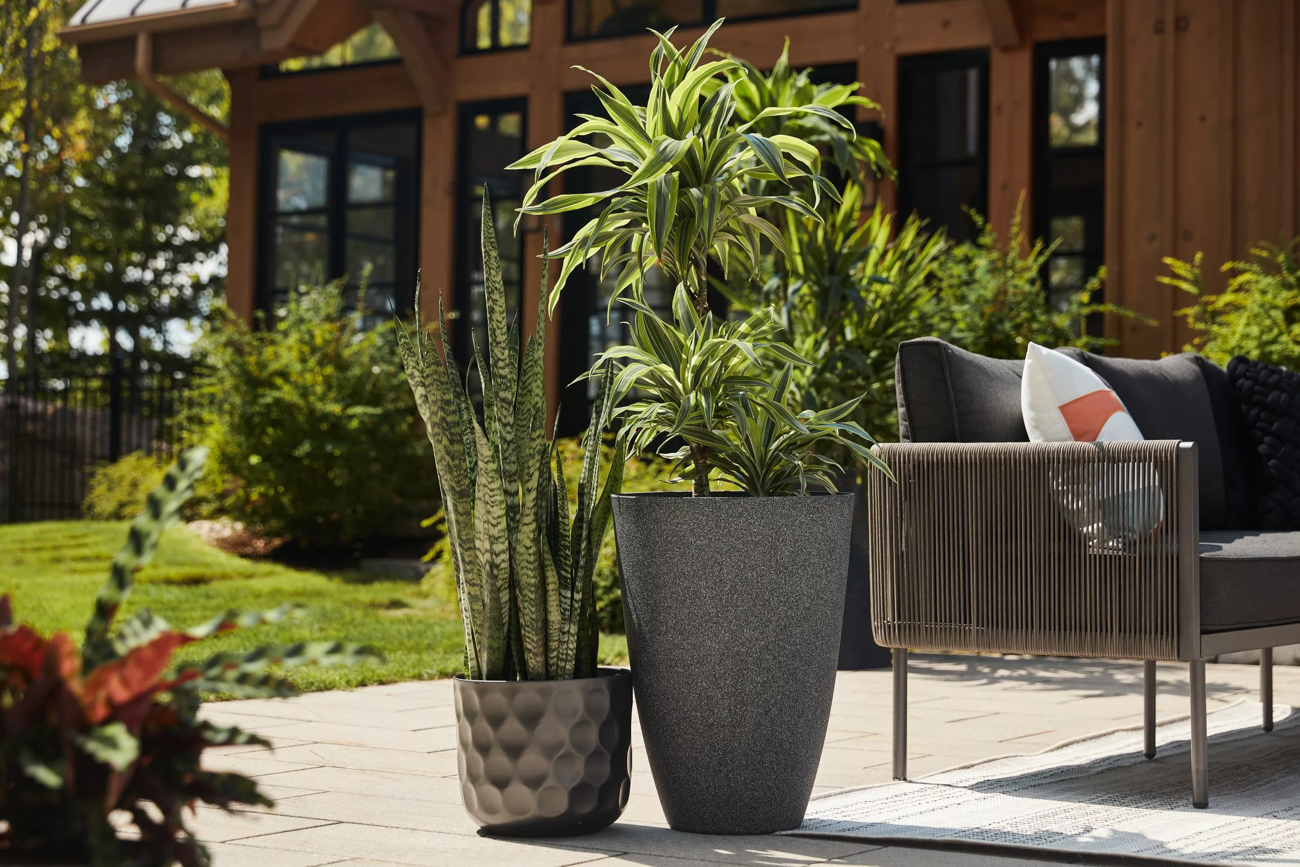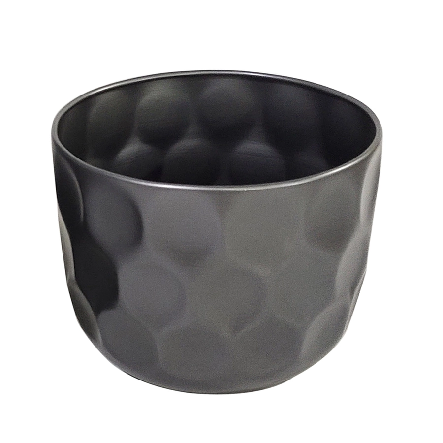 Graphite planter with hex design. Beautiful round shape. Drain hole with plug included. Indoor/Outdoor. Metal.