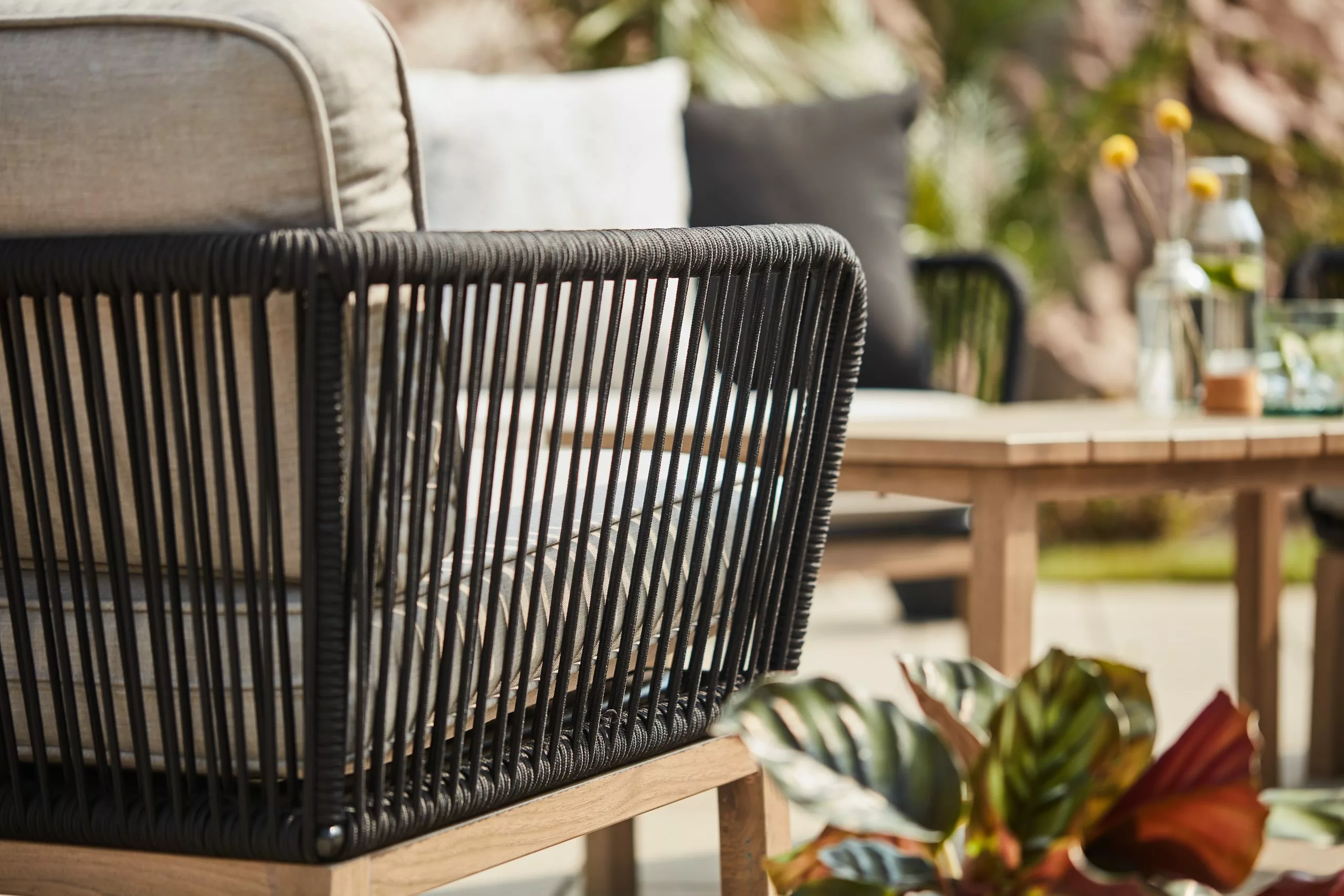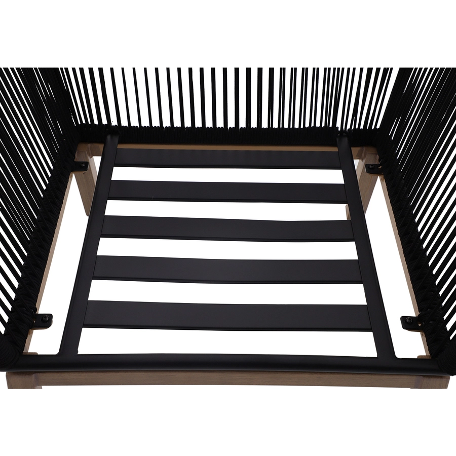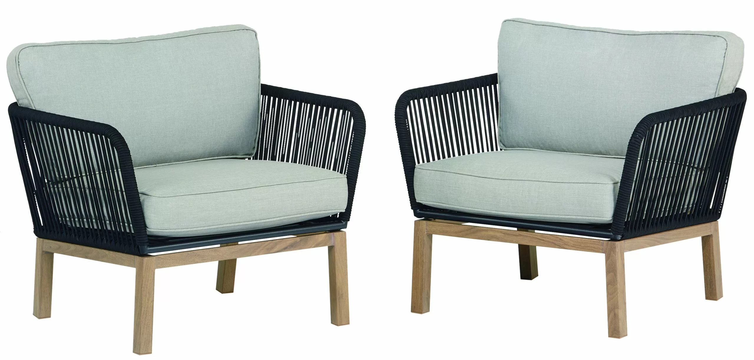 Enjoy the outdoors with these contemporary patio chairs. All-season powder coated steel frame with tasteful, all-weather rope details and complemented by water and UV resistant olefin fabric cushions.